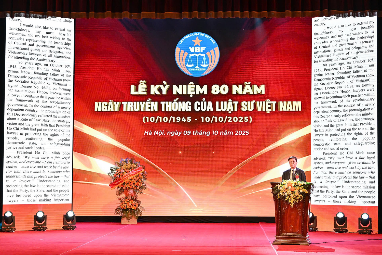 Tối ngày 09/10/2025, tại Nhà hát Lớn Hà Nội, Lễ Kỷ niệm 80 năm Ngày Truyền thống Luật sư Việt Nam (10/10/1945–10/10/2025) diễn ra trang trọng, do Liên đoàn Luật sư Việt Nam chủ trì. Sự kiện có Chủ tịch nước Lương Cường dự và phát biểu chỉ đạo; Tổng Bí thư Tô Lâm gửi lẵng hoa chúc mừng; cùng dự có lãnh đạo các ban, bộ, ngành Trung ương và đại diện luật sư cả nước.